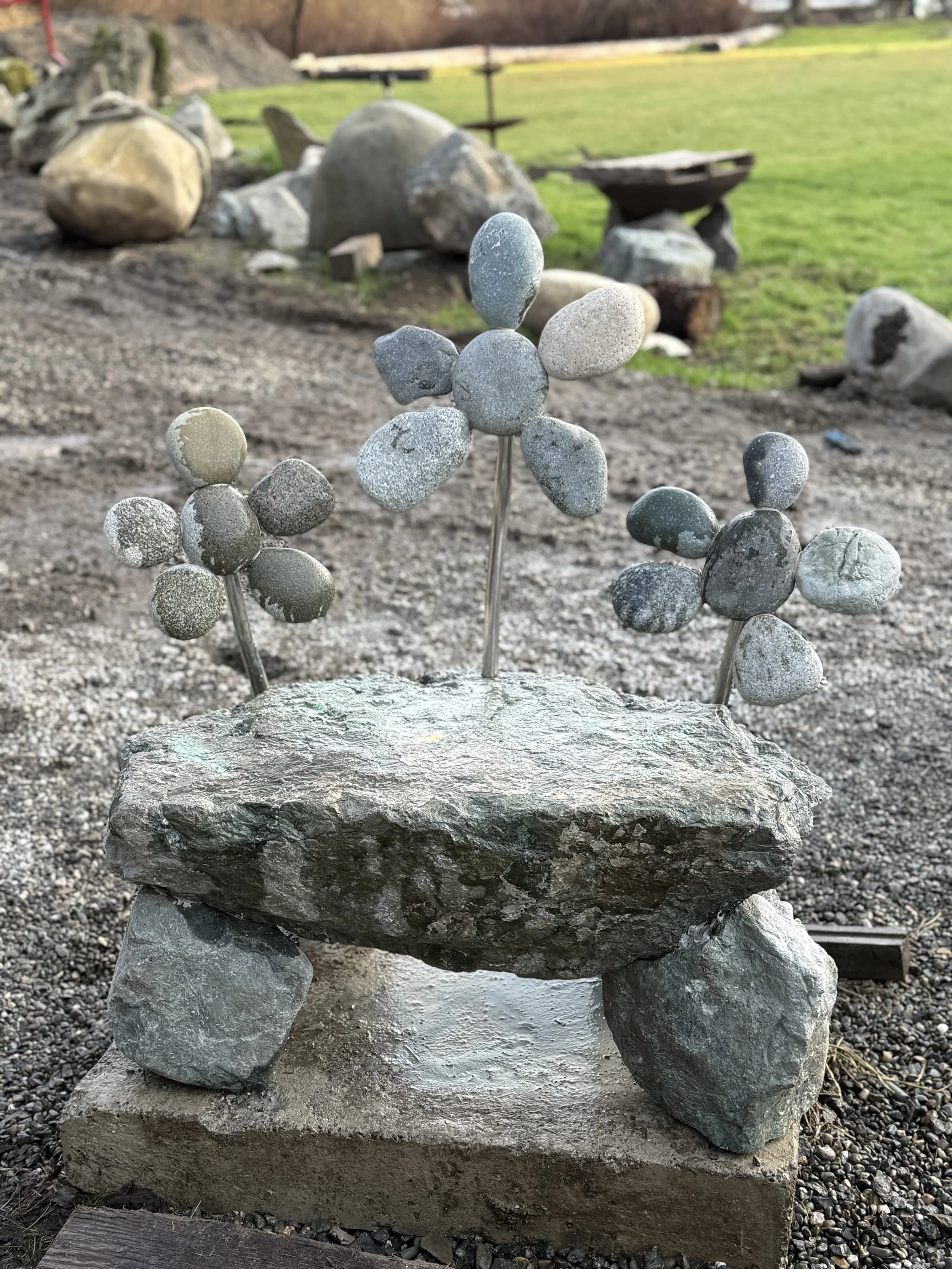 The stone sculptures are created right here at Sticks and Stones Farm, using found stone gathered locally and shaped slowly by hand. Influenced by the land, the rhythm of family life, and the joy of building alongside kids and animals, each piece carries a sense of warmth, whimsy, and groundedness.